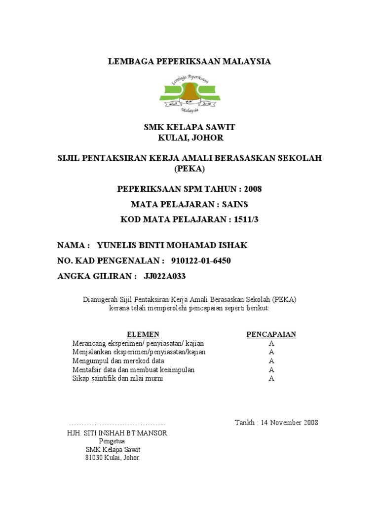 Contoh Sijil Peka from imgv2-1-f.scribdassets.com Memiliki sijil pelajaran malaysia (spm) dengan mendapat kepujian dalam mata pelajaran bahasa melayu / bahasa malaysia dan lulus dalam mata pelajaran sejarah (mulai tahun 2013). Makluman kepada pelajar tingkatan lima pada tahun 2021 yang bakal menduduki peperiksaan sijil pelajaran malaysia (spm). Lulus dalam mata pelajaran matematik/matematik tambahan dan kepujian dalam mata pelajaran prinsip akaun/ ekonomi asas/ perdagangan di peringkat spm; Bil kod singkatan nama program kktm/ikm syarat kemasukan bil kluster diploma lepasan spm lulus spm atau setara dengan tiga (3) kepujian dalam mata pelajaran berikut: Kepujian bahasa malaysia / bahasa melayu kertas julai diambil kira. Keutamaan diberi kepada calon yang memperolehi stpm atau kelayakan lain yang setaraf; Gred minimum keputusan spm d) dua (2) mata pelajaran lain. Jadual lengkap akan dikongsikan selepas pengumuman rasmi dari pihak lpm.